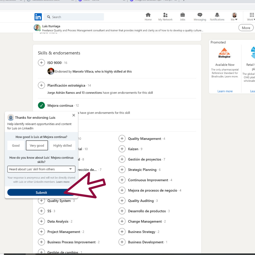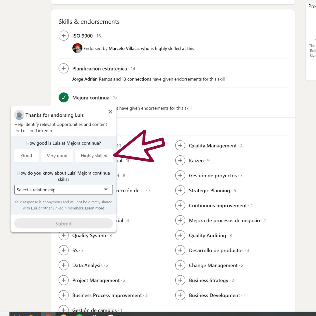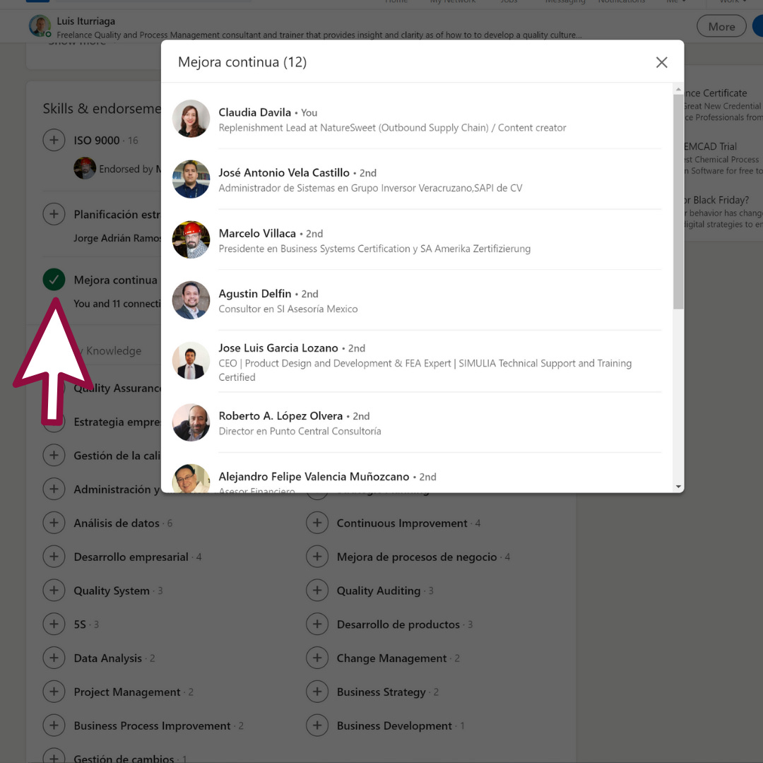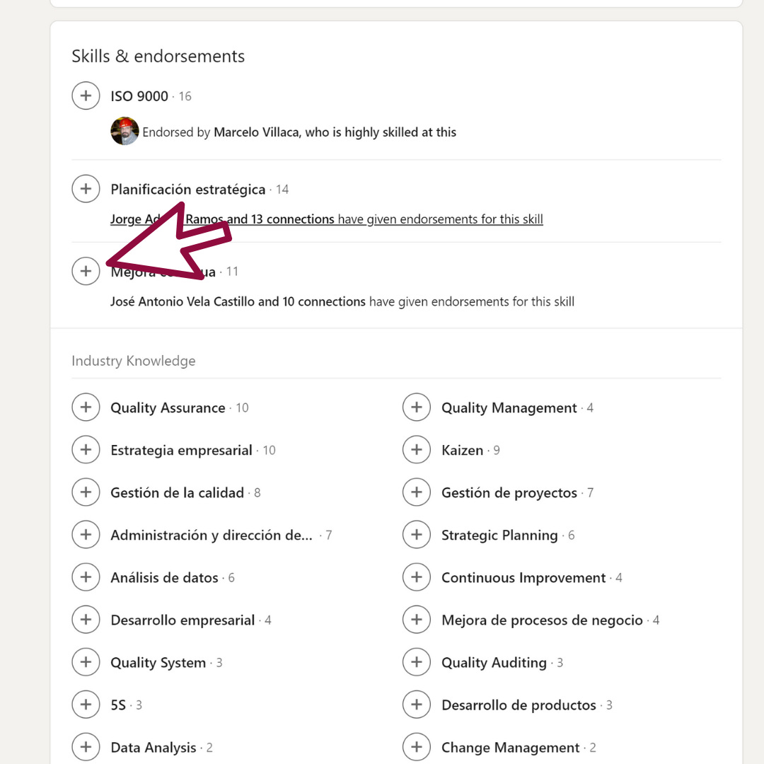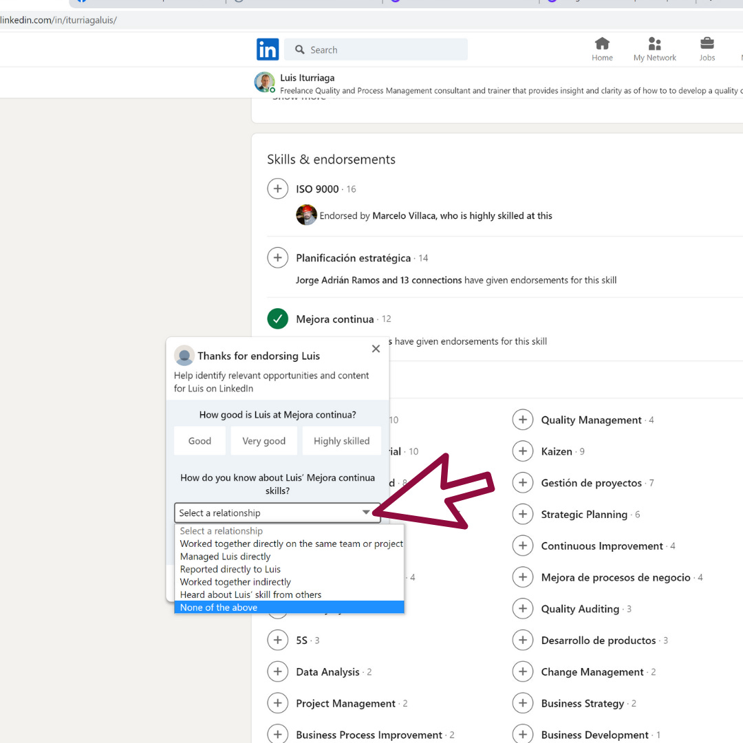 Y del otro lado de la moneda, suponiendo que te encuentras a un consultor en Sistemas de Calidad y te gusta su perfil, puedes revisar quién recomienda las habilidades de esa persona, para ver si esas recomendaciones son relevantes o no. No vale lo mismo que un director general dé su sello de aprobación o un cliente anterior que un ex-compañero de la escuela.
